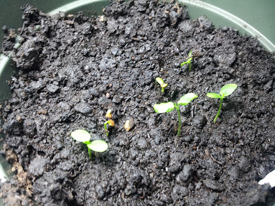 Unfortunately I have them all a good soak right before we had three days of rain. Most of the seedlings seem to be fine but I'm worried the Goji berries may be damping off. Hopefully they'll dry out before I loose any more. By the way, all of these seeds were stored in a fridge for over 4 months. It doesn't seem to affect their vitality. Anyways, without further adieu, here are the seedlings: